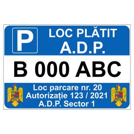 Placuta indicatoare parcare, loc platit A.D.P., numar auto, autorizatia numar, 200x300 mm, PVC, 1 mm