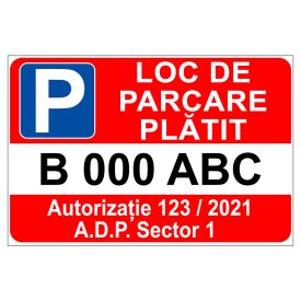 Placuta indicatoare parcare, loc platit A.D.P., numar auto, autorizatia numar, 300x400 mm, PVC, 2 mm