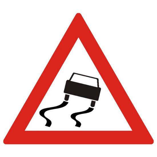 Drum lunecos, A19, indicator de avertizare, Protrafic, 700 mm, folie reflectorizanta clasa 1, otel vopsit se afla montat la 100-200 m de sectorul periculos. Conducătorul auto este obligat să reducă viteza, să circule cu atenţie sporită, să nu bruscheze volanul şi comenzile autovehiculului, şi să evite folosirea frânelor.