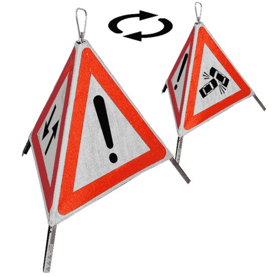 Indicatorul rutier pliabil cu 3 fete este confectionat dintr-o țesătură robustă din plastic. Fixarea pe sol se realizeaza printr-un trepied din otel zincat care-i confera stabilitate ridicata. Mecanismul de rotire permite plierea/ deschiderea ușoară a indicatorului.