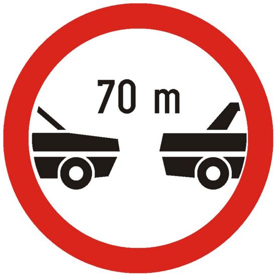 Interzis autovehiculelor de a circula fara a mentine intre ele un interval de cel putin ... m, C21, indicator de interzicere, Protrafic, 600 mm, folie reflectorizanta clasa 1, otel vopsit, indicator de interzicere sau restrictie se instaleaza pe sectorul de drum unde trebuie pastrata o distanta minima intre autovehicule. Poate fi insotit de un panou aditional pe care este inscrisa lungimea sectorului de drum pe care se impune restrictia. Raza de actiune a indicatorului se termina la intalnirea indicatorului Sfarsitul tuturor restrictiilor.