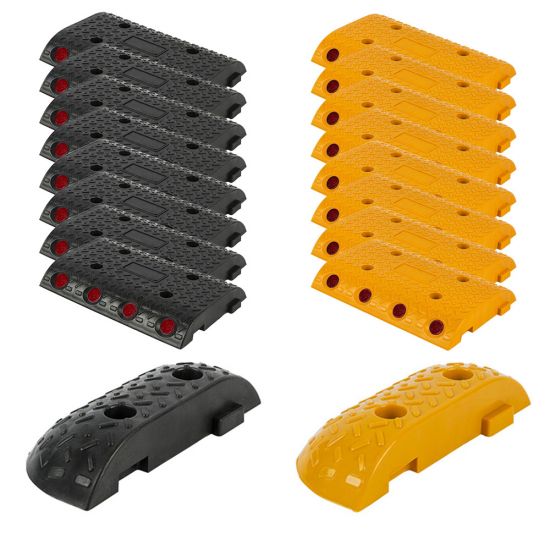 Set limitator de viteza din plastic cu catadioptri pentru strada de 6 metri compus din 16 limitatoare de viteza, culori negru si galben, dimensiune 250x350x50 mm, si 2 capace de limitator de viteza, dimensiune 250x100x50 mm, pentru un total de 5.8 metri.