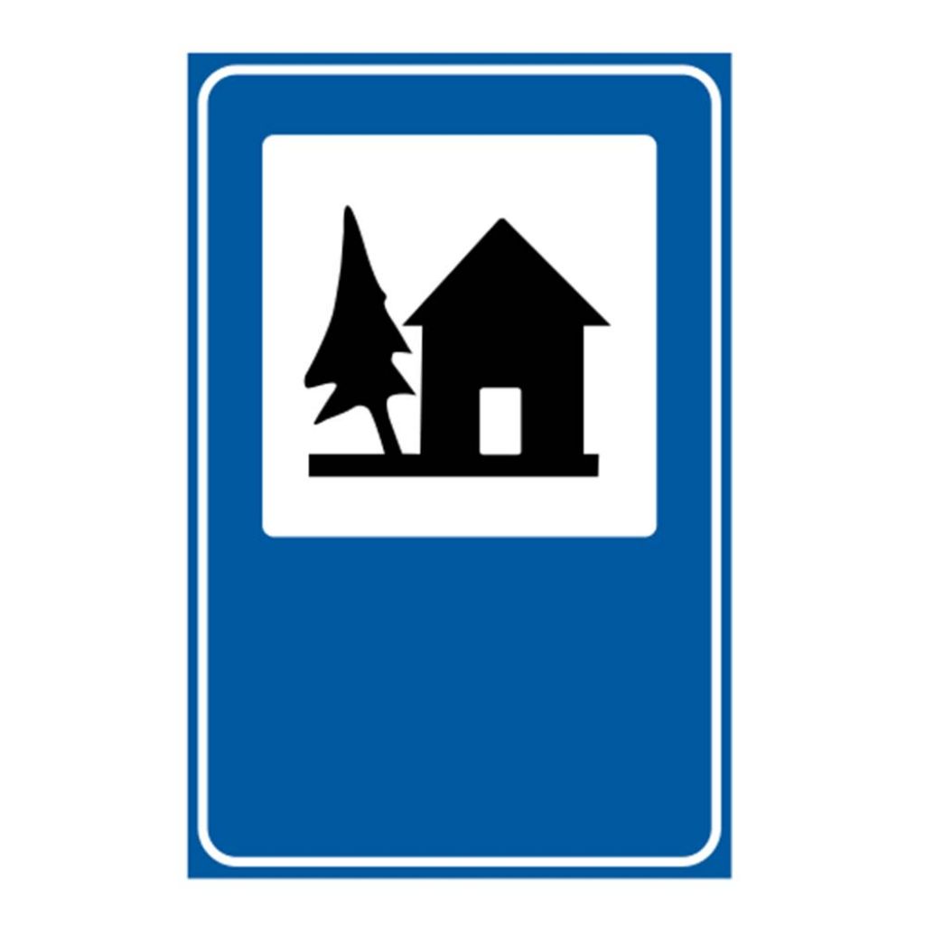 Cabana pentru turisti, G28, indicator de informare, 650x500 mm, folie reflectorizanta clasa 1, otel vopsit.
