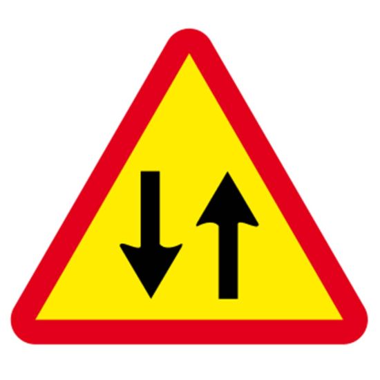 Se întâlnește pe sectoarele de drum unde se execută lucrări pe partea carosabilă, la capătul drumurilor cu sens unic. Indicatorul rutier îl avertizează pe conducător că circulația se desfășoară în ambele sensuri.