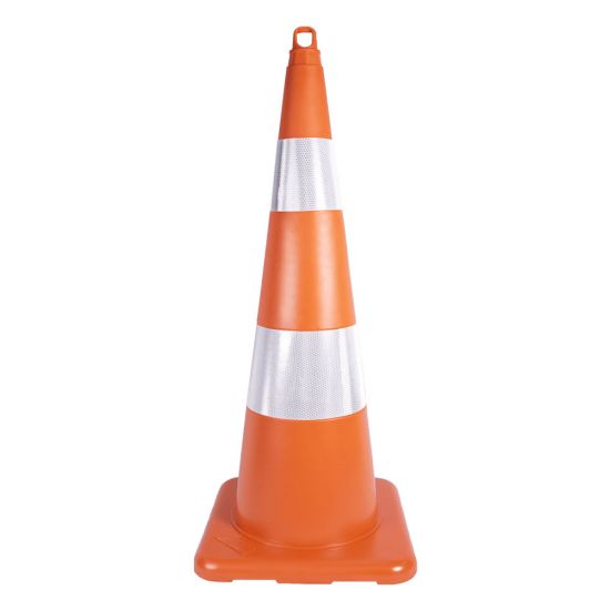 Con pentru trafic inaltime 900 mm, doua benzi reflectorizante, PVC, portocaliu se utilizeaza in amenajarile drumurilor, trotuarelor, zonelor de parcare, zonelor in care intrarea vehiculului este interzisa, ca separator de banda pe drumuri, lucrari de intretinere si reparatii temporare ale drumurilor, santiere etc.