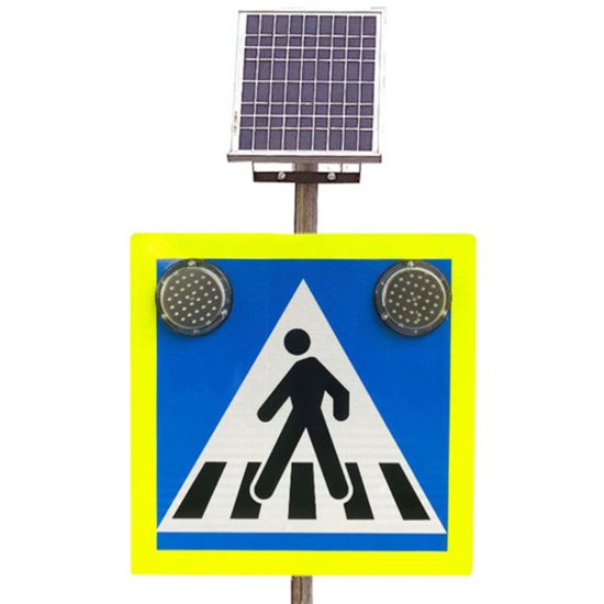 Indicator rutier G2, Trecere de pietoni, cu lampi LED si panou fotovoltaic folosit pentru atentionarea de la distanta asupra existentei unei treceri de pietoni.