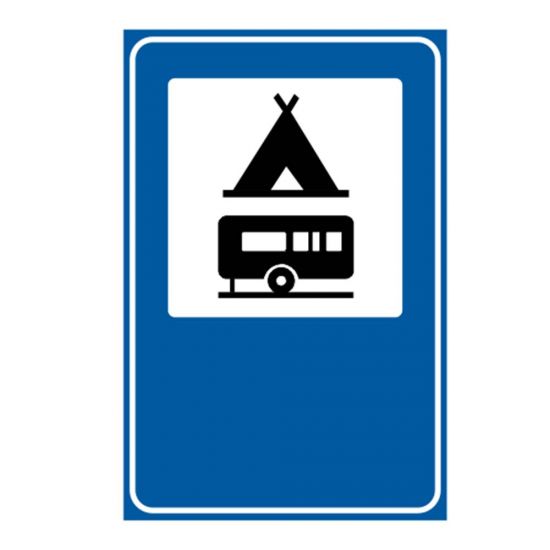 Indicator de informare G26 teren pentru camping si caravane 650x500 mm folie reflectorizanta clasa 1 otel vopsit indicatorul rutier din imaginea alăturată, se întâlnește în apropierea unui teren special amenajat pentru camping și staționare a autovehiculelor și rulotelor.