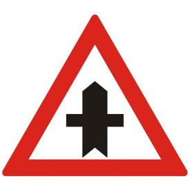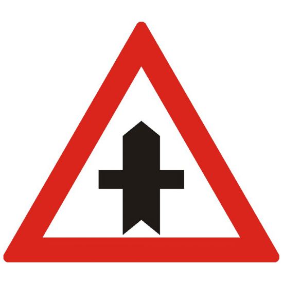 Intersectie cu un drum fara prioritate, A33, indicator de avertizare, Protrafic, 700 mm, folie reflectorizanta clasa 1, otel vopsit, indicator de avertizare se instalează pe drumul cu prioritate in intersecţiile din afara localităţilor. Conducătorii de vehicule care întâlnesc indicatorul au prioritate de trecere iar cei care circulă pe drumul transversal vor întâlnii unul dintre indicatoarele: "Cedează trecerea" sau "Oprire". Oprirea, stationarea, mersul inapoi intoarcerea sunt interzise cu 25m inaintea intersectiei ori in zona de preselectie unde sunt aplicate marcaje cu linie continua. Depasirea si intoarcerea sunt permise in intersectie. Pe timpul noptii si in conditii de vizibilitate redusa la apropierea de intersectie, conducatorii de autovehicule sunt obligati sa schimbe alternant lumina de intalnire cu cea de drum.