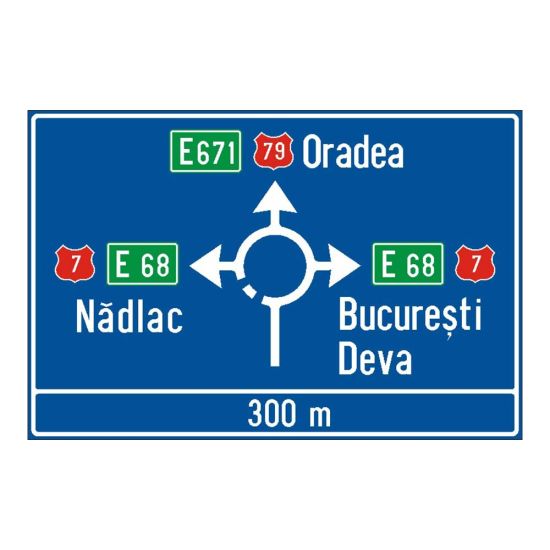 Presemnalizarea directiilor intr-o intersectie cu sens giratoriu F5, indicator de orientare.