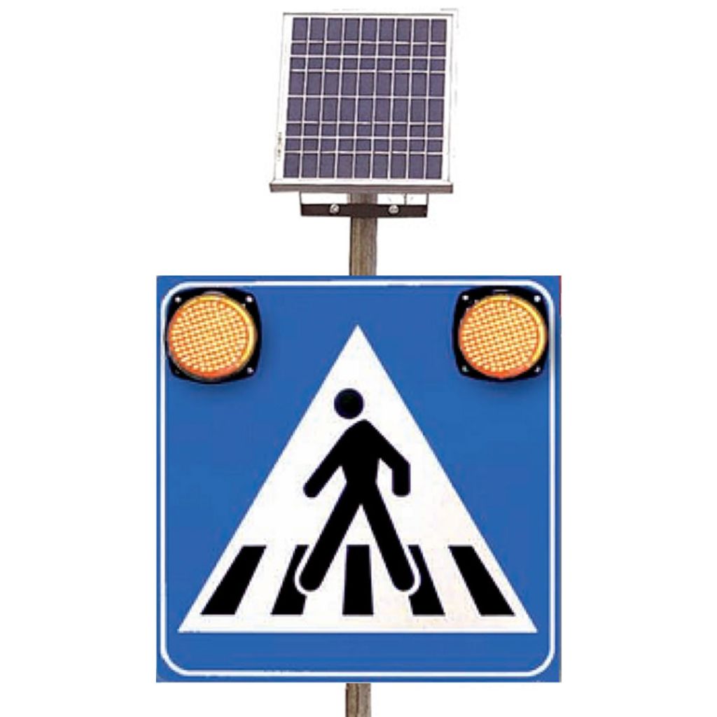 Indicatorul rutier Trecere de pietoni G1 cu lampi LED si alimentare de la panou fotovoltaic este folosit pentru atenționarea de la distantă asupra existenței unei treceri de pietoni. În colțuri sunt prevăzute cu lămpi cu led care sunt vizibile de la mare distantă.