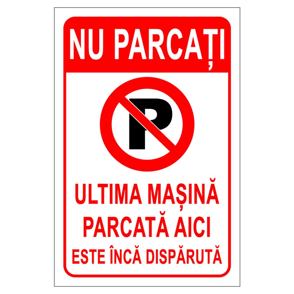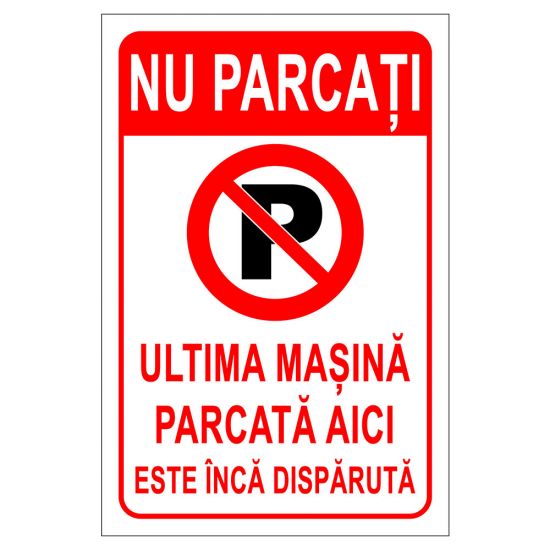 Placuta indicatoare parcare, nu parcati, parcarea interzisa, ultima masina parcata aici este inca disparuta, 200x300 mm, PVC, 1 mm | sigtra.ro
