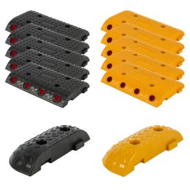 Set limitator de viteza din plastic cu catadioptrii pentru strada de 4 metri compus din 10 limitatoare de viteza, culori negru si galben, dimensiune 250x350x50 mm, si 2 capace de limitator de viteza, dimensiune 250x100x50 mm, pentru un total de 3.7 metri.