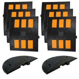 Set limitator de viteza din cauciuc cu pelicule reflectorizante galbene pentru strada de 4 metri compus din 6 limitatoare de viteza, dimensiune 600x500x45 mm, si 2 capace de limitator de viteza, dimensiune 600x300x45 mm, pentru un total de 3.6 metri.