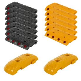 Set limitator de viteza din plastic cu catadioptri pentru strada de 5 metri compus din 13 limitatoare de viteza, culori negru si galben, dimensiune 250x350x50 mm, si 2 capace de limitator de viteza, dimensiune 250x100x50 mm, pentru un total de 4.75 metri.