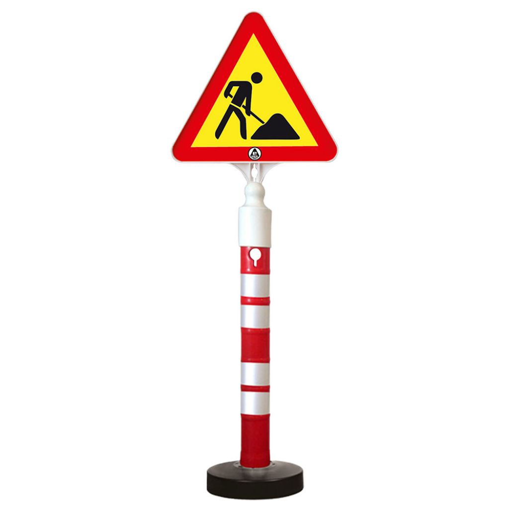 Set format din un stalp cu inaltimea de 1200 mm, o baza cu greutatea de 12 kg si un indicator din plastic pentru lucrari.