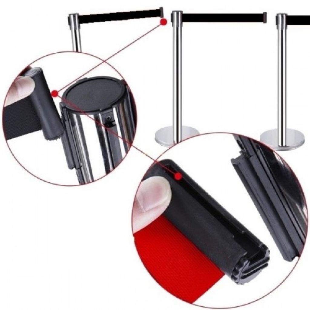 Stalp de ghidare si delimitare, cromat, cu banda retractabila, rosie, 3 metri