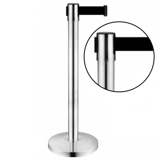 Stalp de ghidare si delimitare, argintiu, cu banda retractabila, neagra, 3 metri folosit la delimitarea zonelor dintr-o anumita incepere unde nu este permisa intrare, la intrarea in restaurante sau hoteluri sau la diverse evenimente sau spectacole.